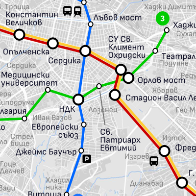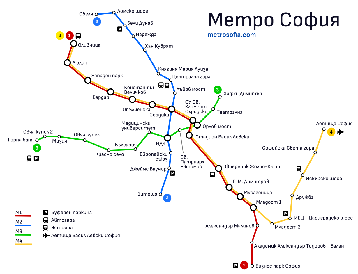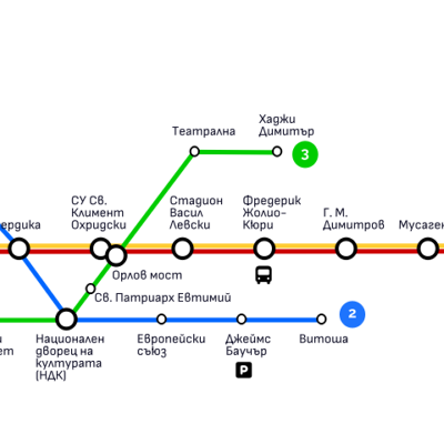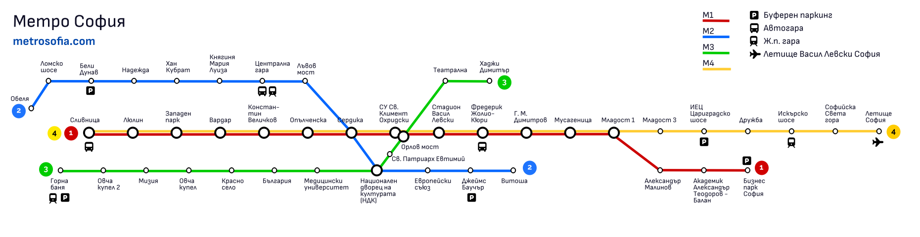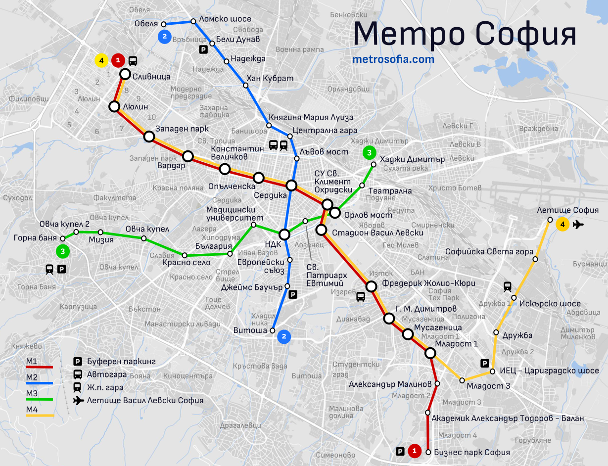Линиите и станциите на метроро в София показани в удобен компактен вид